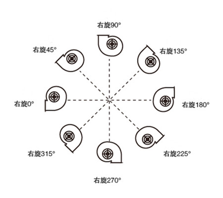 注:玻璃鋼離心風機的方向可以在允許的范圍內進行定制,如118°、35°等這些不規則的角度。