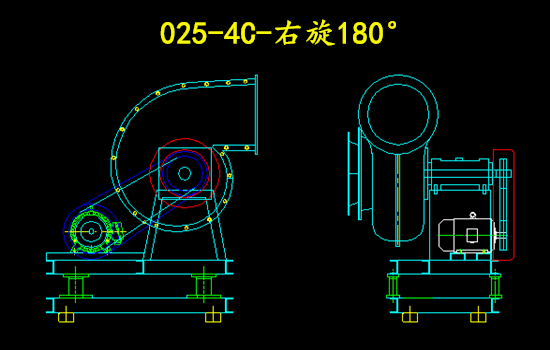 上圖為右旋180°的025-4C風機,人站在電機端正視風機,風機葉輪的出風方向為順時針。