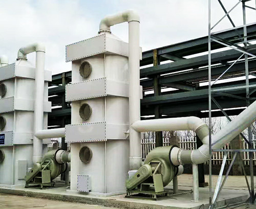 比如在電鍍廠使用的玻璃鋼凈化塔,其主要的作用是除去氣體中的酸性成分。在工作時,在塔內循環噴淋堿性吸收液,與含酸性成分的氣體發生中和反應從而達到除去酸性成分的目的。