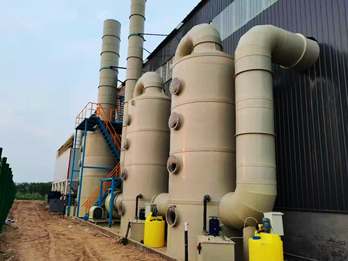 在廢氣處理工程中必不可少的設備有兩種,一種是通風設備,另一種是廢氣凈化設備。而通風設備就是本公司主營的玻璃鋼離心風機,廢氣凈化設備則根據具體的需求進行選擇,如下圖中的PP凈化塔就是比較常見的廢氣凈化裝置。除了凈化塔之外,活性炭吸附塔、等離子分解裝置、除臭裝置等都是用來凈化廢氣的。在使用時玻璃鋼離心風機通過管道與這些設備連接在一起。下圖是玻璃鋼離心風機與廢氣處理裝置的使用圖展示。